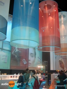 Und so funktionieren die Audio Spotlights: Während konventionelle Lautsprecher den Schall in einem weiten Bereich abstrahlen, arbeiten Richtlautsprecher mit gebündelten Ultraschallwellen und erzeugen in einem schmalen Kegel hörbare Töne. Stimmen, Musik etc. sind also nur an einem ganz bestimmten Punkt hörbar. Entwickelt hat das System der US-Wissenschaftler und Holosonic-Gründer Joseph Pompei.