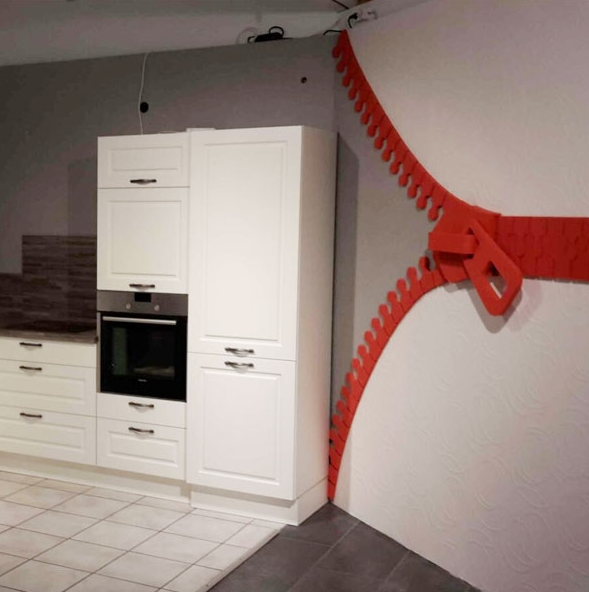 „Ich hatte nach dem Einzug in unsere neue Wohnung im Flur eine kahle Wand. Erst hatte ich versucht die Wand mit Farbe ansehnlich zu gestalten, das hat aber an der Eintönigkeit nichts geändert. Später versuchte ich ein geeignetes Bild oder Ähnliches zu finden, aber auch diese Gestaltungsform hat mich nicht zufriedengestellt. Dann habe ich verschiedene Wandtattoos in Augenschein genommen und habe mich aufgrund von einer farblichen Trennung der Wandtapete für Reißverschlüssen entschieden.