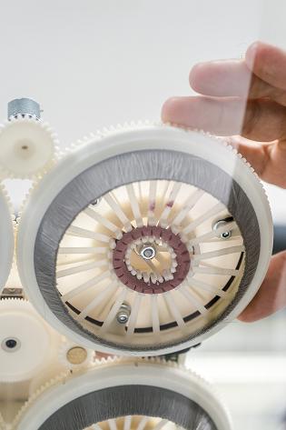 Roboter wie zum Beispiel autonome Rasenmäher oder Staubsauger fahren meist auf Rädern, wobei die Mäh- bzw. Saug-Funktion einen zweiten, separaten Antrieb benötigt. Ziel des Putzroboter-Projekts ist es, Putz- und Fortbewegungsfunktion so zu koppeln, dass ein Antrieb für beide genügt und damit energiesparender ist. Dafür entwickelt der Projektleiter und Mechatronik-Ingenieur Marco De Angelis von der Hochschule Luzern mit seinem Team eine neue Bewegungsart, die in einem Prototyp erfolgreich umgesetzt wurde: «Die vier Rundbürsten des PV-Putzroboters sind über eine Kurvenscheibe jeweils mit einer Art Silikon-Raupe verbunden: Wird die Kurvenscheibe angetrieben, drehen sich die Bürsten und gleichzeitig drückt die kleine Erhöhung der Scheibe viele radial angeordnete Hebel so, dass diese die kreisförmige Silikon-Raupe in einer kontinuierlichen Bewegung Stück für Stück auf die zu putzende Fläche drücken.»