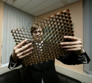 Bei SwissCell handelt es sich um Hybridpaneele in seit Jahrzehnten bewährter Waben-Technologie. Dabei besteht der Kern der Platten aus sechseckigen Strukturen, ähnlich einer Honigwabe. Dies ergibt äußerst stabile und dabei sehr leichte Halbfertigprodukte, beispielsweise für Tore und Trennwände, aber auch im Fahrzeug- und Flugzeugbau. Nachteile herkömmlicher Waben-Technologie: Die Zellkerne müssen aus einem Material bestehen, das bei möglichst geringem spezifischen Gewicht hohen mechanischen Belastungen standhält, Aluminium beispielweise. Das macht die Fertigung aufwändig, teuer und energieintensiv.