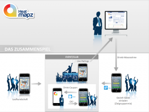 HeatMapz ist Enduser- und Businesslösung in einem. So wird HeatMapz von der Party-Community hauptsächlich via iPhone oder Android App genutzt, um zu sehen oder mit zu teilen wo gerade die beste Party statt findet oder wo sich gerade die Facebook Freunde befinden. Und natürlich können mit den Smartphone Apps die Coupons empfangen, gespeichert oder weiter verschenkt werden. Auch das Einlösen der Coupons in einem Club oder in einer Bar funktioniert ohne Aufwand mit dem Handy.