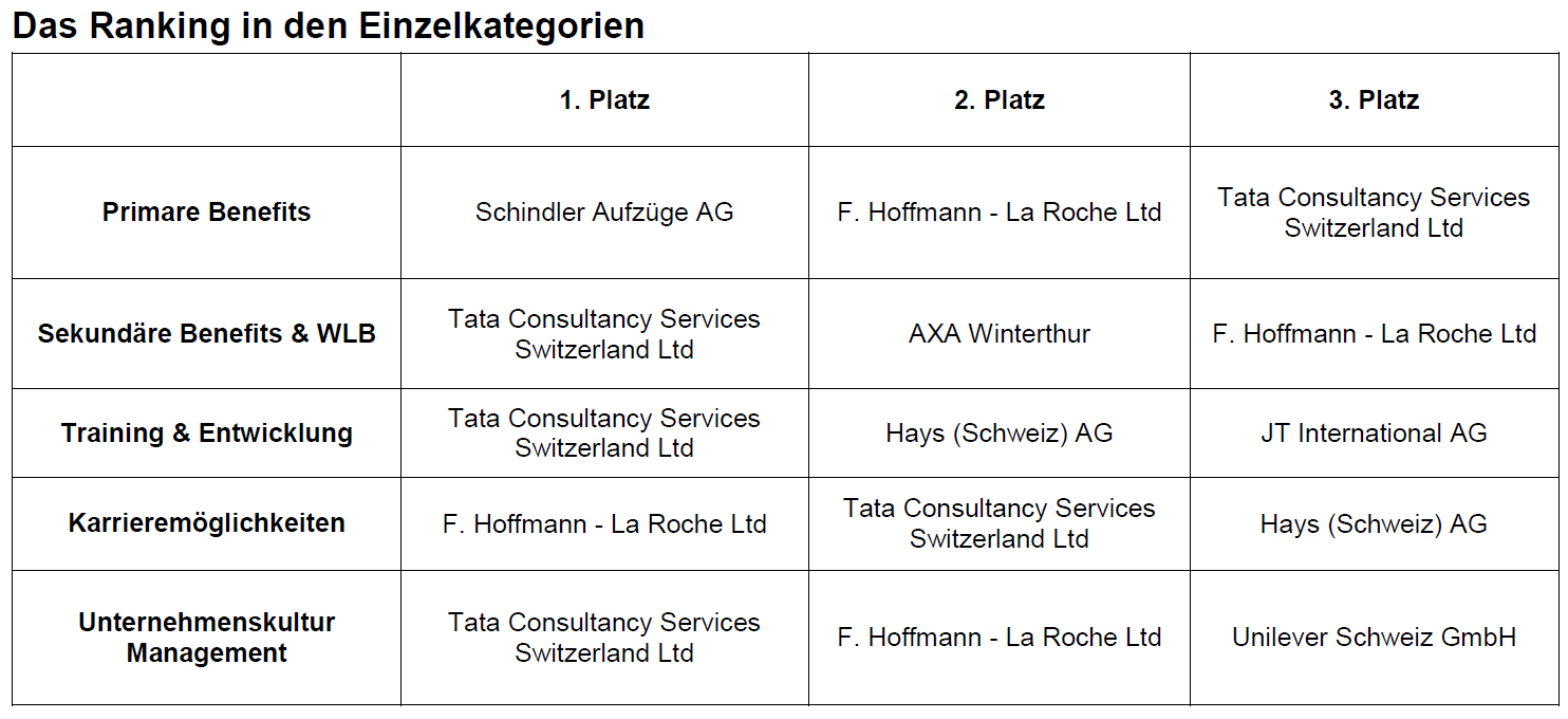 Bewertet wurden die Teilnehmer in den fünf Kategorien Primäre Benefits (Vergütung), Sekundäre Benefits (u.a. Work-Life-Balance), Training und Entwicklung, Karrieremöglichkeiten sowie Unternehmenskultur Management.